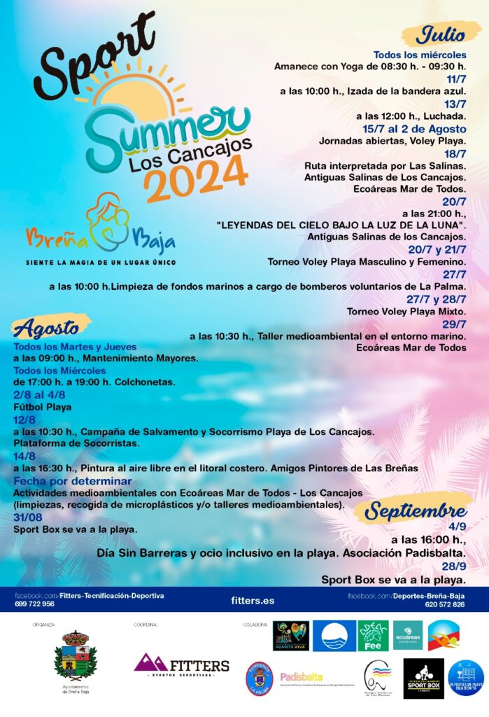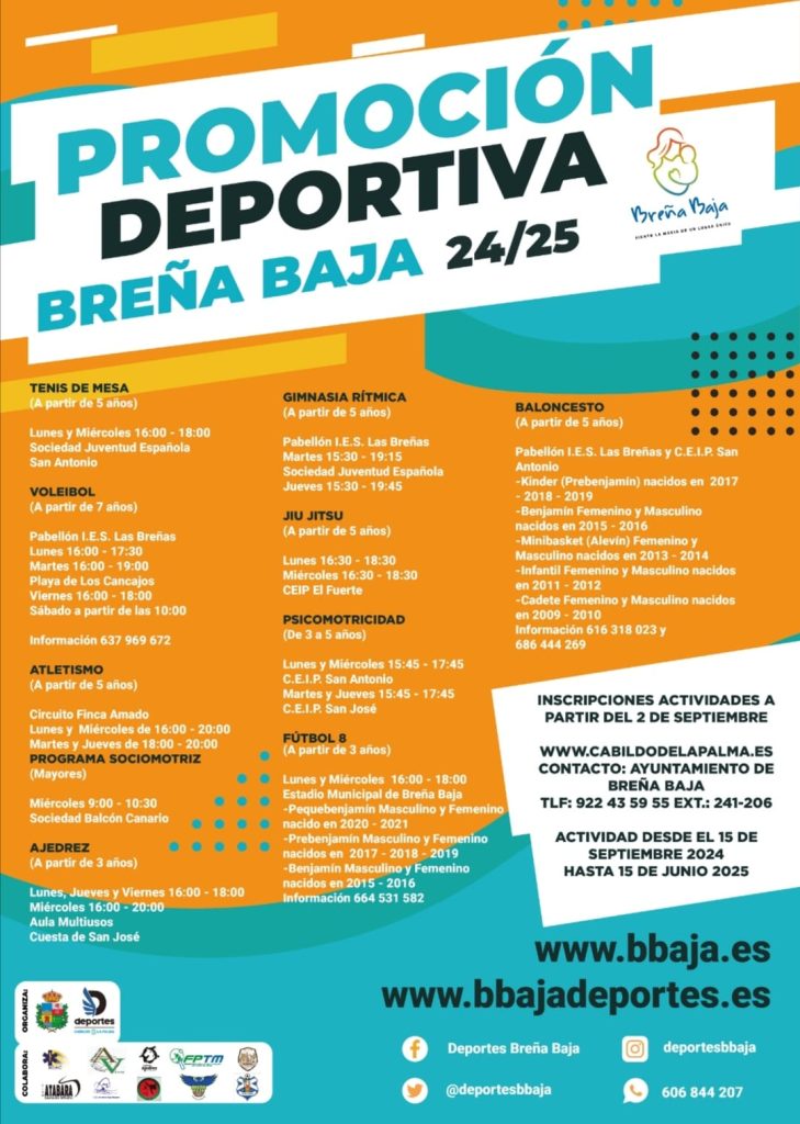 El Ayuntamiento de Breña Baja inicia un año más, de la mano del Cabildo de La Palma, su programa de Promoción Deportiva para todas las edades de cara al curso 2024 / 2025 con un decena de posibles deportes y actividades. Para su desarrollo, que se prolongará entre el 15 de septiembre de 2024 y 15 junio de 2025, contamos con espacios como los CEIP de San José y San Antonio, el Estadio Municipal de Breña Baja, el IES Las Breñas, el Centro Polivalente de Las Ledas, entre otras. Conócelas en la sección Instalaciones.